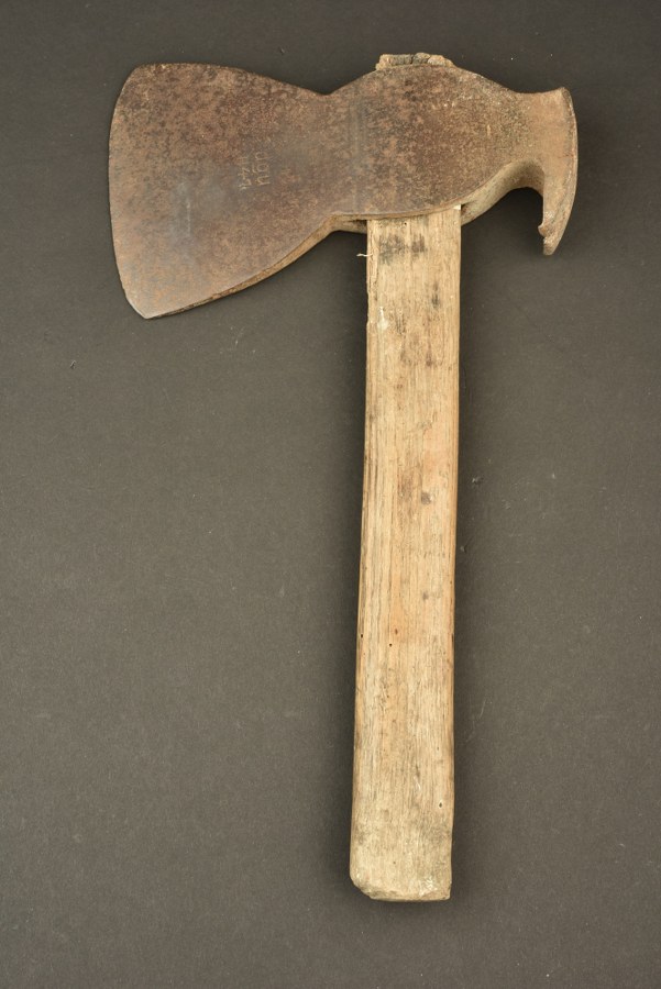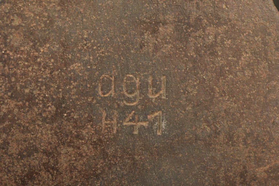 Hachette individuelle provenant de Tournai sur Dive. Manche en bois dépourvu de peinture. Partie métallique oxydée, marquée DGU H 41. A noter une certaine usure et oxydation de la pièce. Selon les informations du vendeur ce gant provient de Tournai sur Dive. Etat II-. Plus de photos sur WWW.AIOLFI.COM, more photos on WWW.AIOLFI.COM.