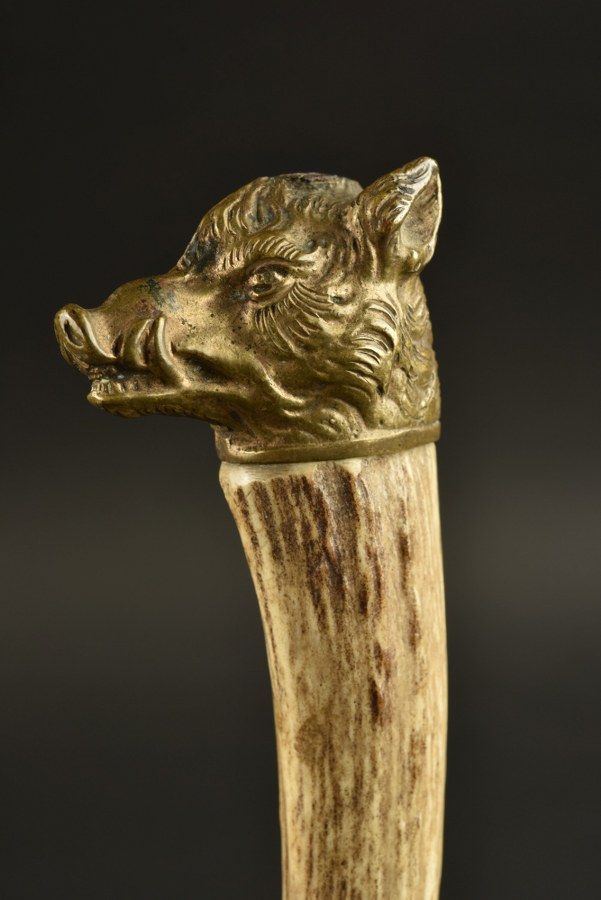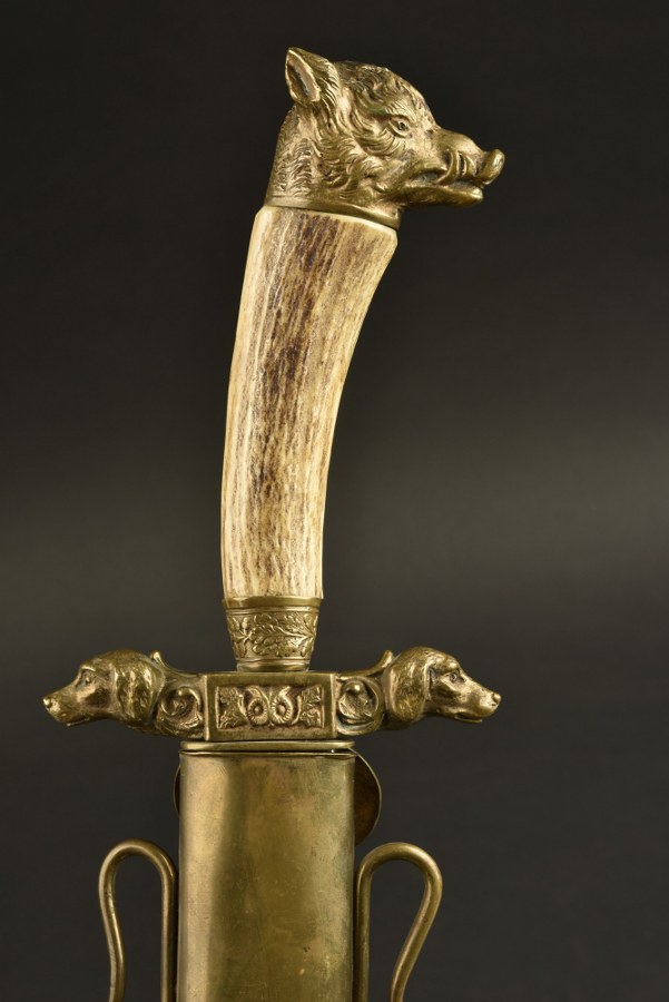 Dague de vènerie allemande. Pommeau représentant un sanglier, garde à deux têtes de chien surmontée d'une couronne de lauriers, la coquille évoque une scène d'un cerf aux prises avec trois chiens. Poignée en bois de cerf, lame gravée sur les deux côtés de décors de chasse. Lame 44,5cm. Fourreau composé de cuir et orné de laiton décoré, la bouterolle possède un poinçon à la couronne, partie basse du fourreau restaurée. Petit couteau de chasse présent, manche en bois de cerf. Etat II+. Plus de photos sur WWW.AIOLFI.COM, more photos on WWW.AIOLFI.COM.