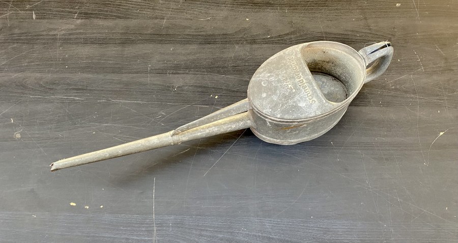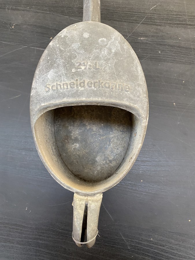 En metal, grand modele de burette en forme d arrosoir. Marquages 2 1 2L Schneiderkanne. Poignee complete. Bec verseur plie au bout. A noter une certaine usure et patine de la piece. Plus de photos sur aiolfi.com. Made of metal, large model of a watering can shaped burette. Markings 2 1 2L Schneiderkanne. Complete handle. Spout bent at the end. Note some wear and patina of the part. More photos on aiolfi.com.