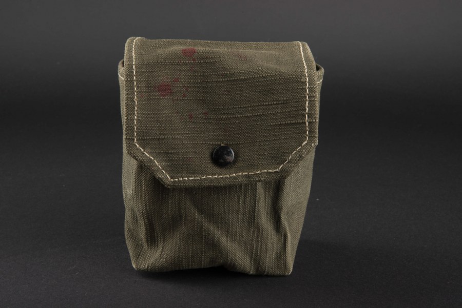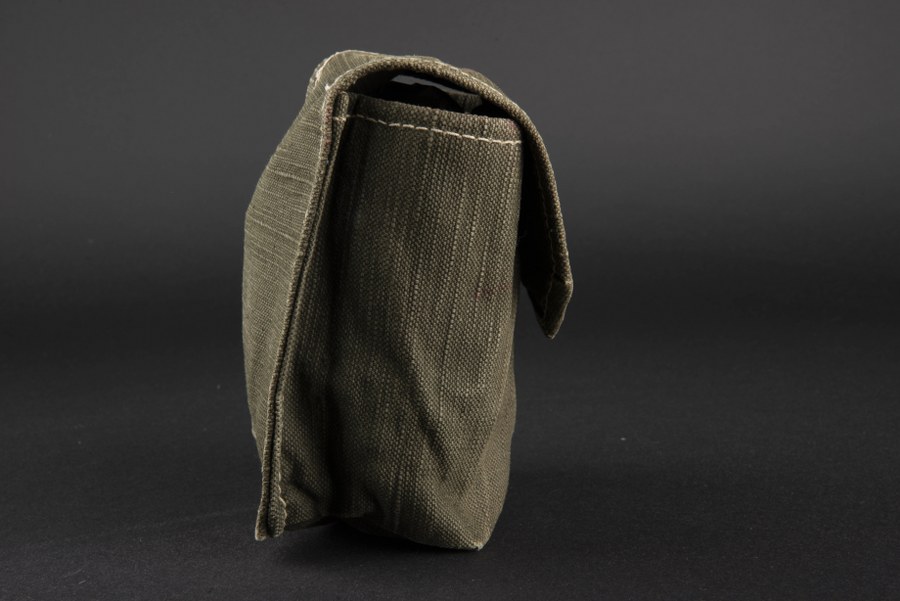 En forte toile Feldgrau, bouton pression fonctionnel. Sans marquages visibles. Quelques taches rouge sur le rabat. A noter une legere usure et patine de la piece. Plus de photos sur www.aiolfi.com. In strong Feldgrau canvas, functional snap button. Without visible markings. Some red stains on the flap. Note a slight wear and patina of the part. More photos on www.aiolfi.com.