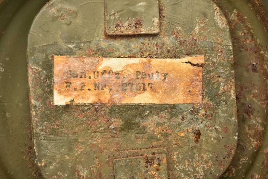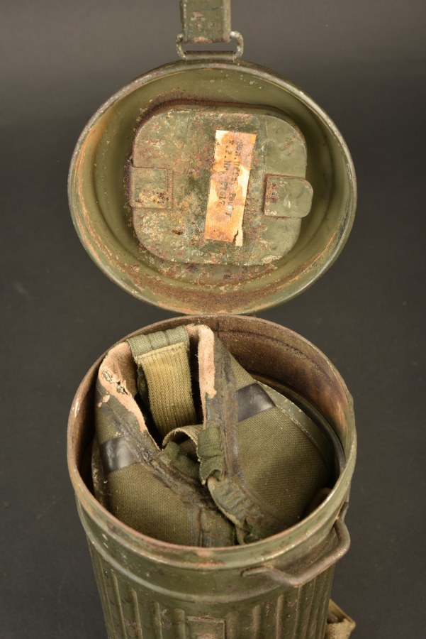 Masque anti-gaz allemand. Boitier long. Peinture Feldgrau à 60%. Seule la petite sangle est présente et la tirette sont présentes. Numéro 7/3 peint sur le côté du boitier. Verres de rechange présents sous le couvercle. Etiquette nominative sous le couvercle SAN UFFZ Pauly FP Nr 27617, correspondant au 3. kleine Kraftwagen-Kolonne Infanterie-Divisions-Kolonne 199. Masque en toile complet, toutes les sangles sont présentes, marquages 7/3. Filtre FE 42 présents, daté juin 1944. Tous les accessoires sont absents. A noter une certaine usure et patine de la pièce. Etat II+. Plus de photos sur WWW.AIOLFI.COM, more photos on WWW.AIOLFI.COM.