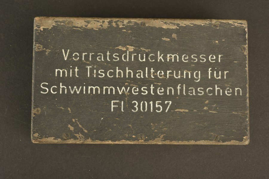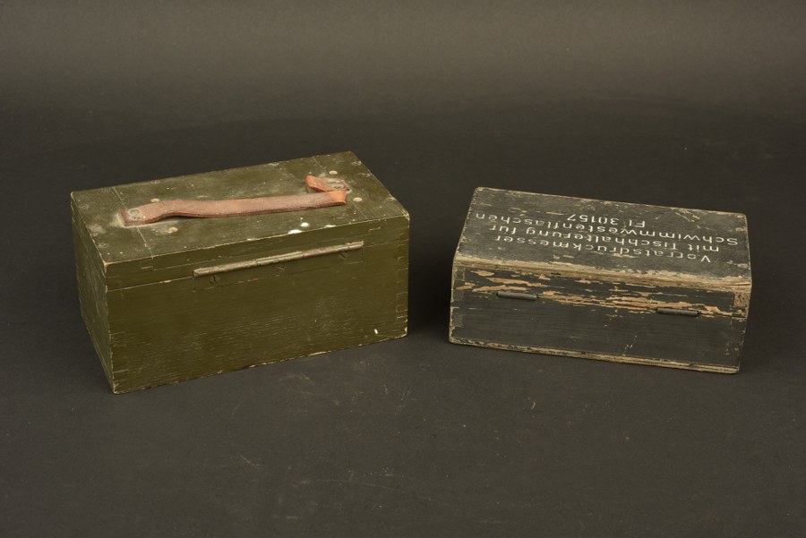 Boites FL 30157. Comprenant une boite en bois, peinture à 70%. Fermeture fonctionnelle, marquages sur le couvercle Vorratsdruckmesser mit Tischhalterung für Schwimmwestenflaschen FL30157. Vide. Une boite en bois vide, sangle en cuir déchirée. Fermeture complète. Notice présente. A noter une certaine usure et patine des pièces. Etat II+. Plus de photos sur WWW.AIOLFI.COM, more photos on WWW.AIOLFI.COM.
