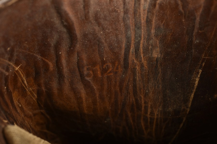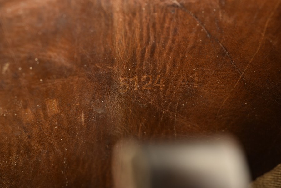 Bottes troupe allemande. Tiges courtes. En cuir noir. Marquages 5124 41 à l'intérieur des bottes. Semelles et talons cloutées et ferrés. Paire homogène, approximativement une pointure 41 française. A noter une certaine usure et patine des pièces. Etat II+. Plus de photos sur WWW.AIOLFI.COM, more photos on WWW.AIOLFI.COM.