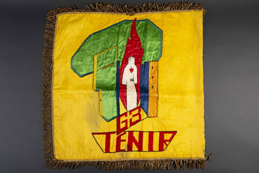 Un fanion du Groupe 3 De Foucauld du Groupement 18 confectionné en tissus couleur jonquille, sur une face se trouve le profil et la silhouette de Charles De Foucauld surmontant la mention G3 tenir. Sur l'autre face se trouve le cigle CJF 18 De Foucauld. Arborant des franges a cannetille doré, la bordure accolée au mât se trouve décousu, de dimension 18x49. Le groupement 18 dit Chevalier-d 'Assas était situé à Le Vigan (Gard) puis à Maurs (Cantal). Provenance collection Christian Cournol.