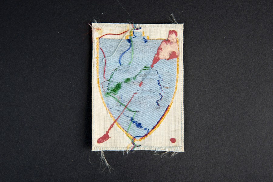 Lot de 2 insignes du Groupement 17 comprenant, un insigne tissus 1er modèle du Group 2 sur fond rouge, un insigne tissus 1er modèle du 1er Groupe sur fond bleu. Le Groupement 17 dit Mistral était situé à La Plage d'Hyères (Var). Provenance collection Christian Cournol.