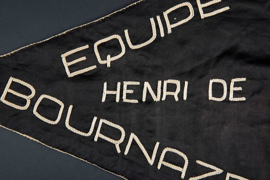 Un fanion du Groupement 36 du Groupe de direction Cyrano, équipe Henri de Bournazel, fanion bicolore, sur la face noire se trouve les inscriptions au fils de coton blanc Groupe Cyrano équipe Henri de Bournazel. Sur l'autre face se trouve un capitaine des spahis brandissant son sabre avec la devise mon âme a Dieu mon corps a ma Patrie mon honneur a moi. Dimensions 45x37 cm. Le Groupement 36 dit Montcalm était situé à Casteljaloux (Lot-et-Garonne) puis à Sainte-Livrade (Lot-et-Garonne). Provenance collection Christian Cournol.
