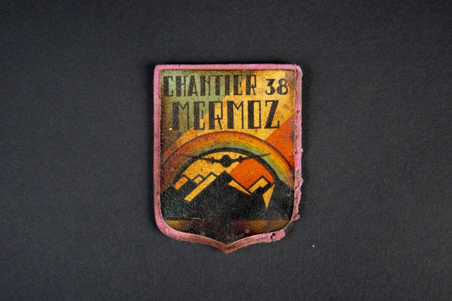 Lot de 2 insignes du Groupement 38 comprenant, un insigne 1er modèle du Groupe 8 en cuir peint sur feutrine grise, un insigne 1er modèle du Groupe 10 en cuir peint sur feutrine verte. Le Groupement 38 dit Jean-Mermoz était situé à Argelès-Gazost (Hautes-Pyrénées) puis à Nontron (Pyrénées-Atlantiques) et à Belin (Gironde). Provenance collection Christian Cournol.