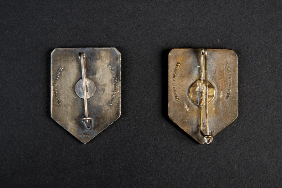 Lot de 2 insignes en métal du Groupement 46 comprenant, un insigne en métal émaillé avec dune de couleur rouge foncée de fabrication Drago Beranger, une variante d'insigne du Groupement 46 en métal émaillé dune de couleur orange a noter quelques chocs d'émaille de fabrication Drago Beranger. Le Groupement 46 dit Suffren était situé à Le Cannet-des-Maures (Var). Provenance collection Christian Cournol.