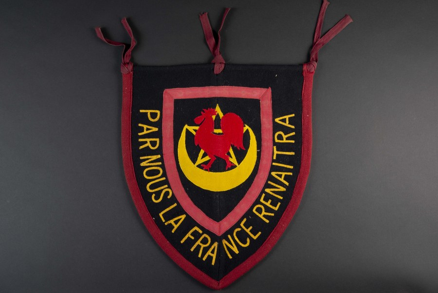 Une flamme de trompette des Chantiers de la jeunesse d'Afrique du nord. Les deux faces sont identiques, au centre se trouve le coq surmontant le croissant avec en arrière plan l'étoile chérifienne entouré de la devise par nous la France renaitra, un insigne se trouve épinglé sur l'une des faces en métal peint de fabrication Grazziani non marqué et avec quelques éclats de peinture. Dimensions 40x32 cm. Ecole régionale des Chefs d'Afrique du Nord. Provenance collection Christian Cournol.