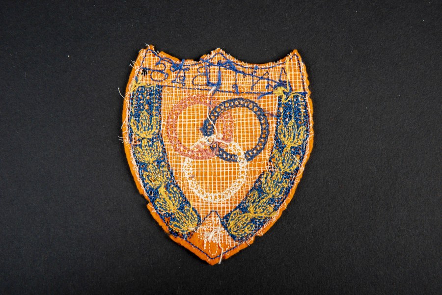 Un insigne tissus du collège national des moniteurs et athlètes, un insigne tissus brodé CNMA Antibes CJF, brodé au fils de coton sur feutrine orange, dimensions 7,5x8cm. Collège national des moniteurs et athlètes, rattaché au commissariat à l'éducation général et aux sports. Il forme, entre autres, les moniteurs des Chantiers. Provenance collection Christian Cournol.