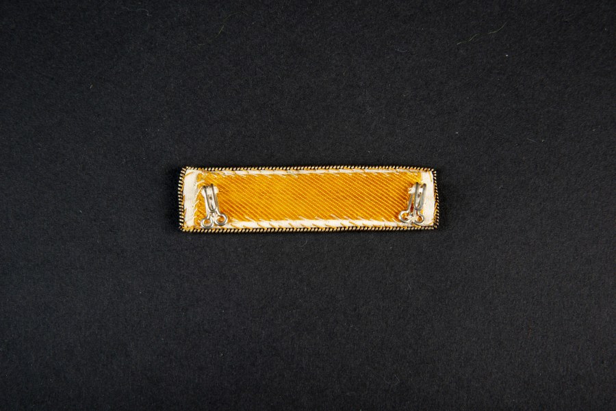 Une barrette du service de santé des Chantiers de la jeunesse, barrette d'infirmer des Chantiers au sein d'un Commissariat général sur tissus blanc confectionné avec croix brodée au fils de coton sur un tissus soyeux blanc et entouré d'un fil de cannetilles doré. Grades brodés au fils dorés. A l'arrière se trouve 2 agrafes de fixation. Service de santé des Chantiers de la jeunesse. Provenance collection Christian Cournol.