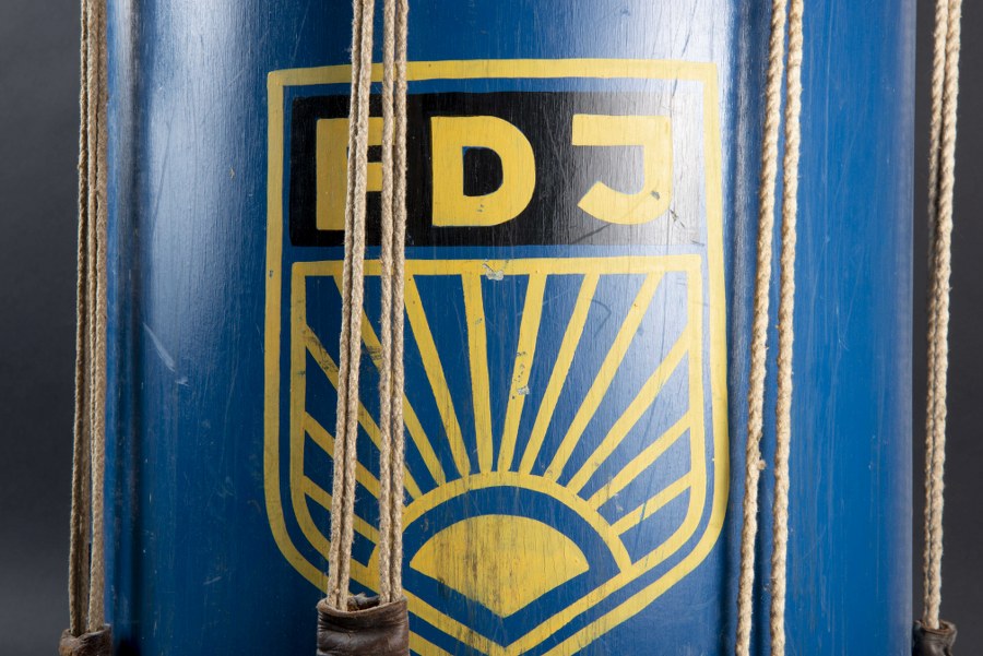 Un tambour réglementaire aux couleurs de la fédération des jeunes et portant son emblème, pots en bon état, lanières et cuir souples, baguettes recouverte de feutre, dimensions 54x38cm. Provenance collection Christian Cournol.