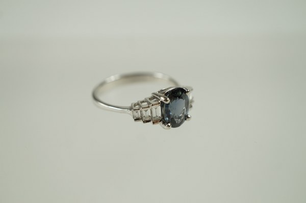 Bague or blanc (750/°°°) sertie d'un Saphir vert taille ovale d'environ 1,70 ct épaulé de 6 diamants blancs taille baguette 0,20 ct en chute. TDD : 53,5. Poids brut : 3,10 gr.