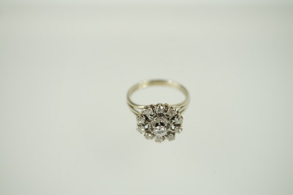 Bague marguerite (750°°°) en or blanc. Sertie de brillants dont un central d'environ 0,10 carat. TDD : 50,5. Poids : 3,6 gr.