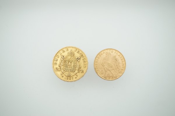 Pièce de 20 francs or et une pièce de 10 francs or.