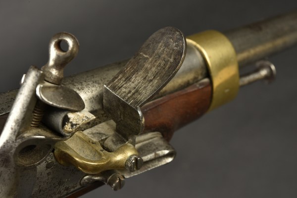 Pistolet de cavalerie modèle An XIII. Canon rond à pans au tonnerre, marquage sur le pan supérieur gauche B en majuscule cursive, et C 1810, rien visible sur la queue de culasse. Platine à silex gravée de la Manufacture Impériale de St Etienne et poinçon J couronné. Toutes garnitures laiton avec poinçons de D couronné sauf l'embouchoir P couronné. Crosse en noyer, marquage à froid G.BRARD et chiffre 10. Mécanisme fonctionnel. Baguette type clou. Usure et patine. Etat II