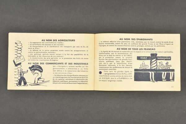 Petit livret édité par les Croix de Feu et intitulé "Programmes", reprenant la vision du parti concernant l'Etat, le régime, le Gouvernement, le Parlement, la politique étrangère, défense Nationale ou l'organisation Economique. Complet 15 pages, dimensions 2x13cm II+