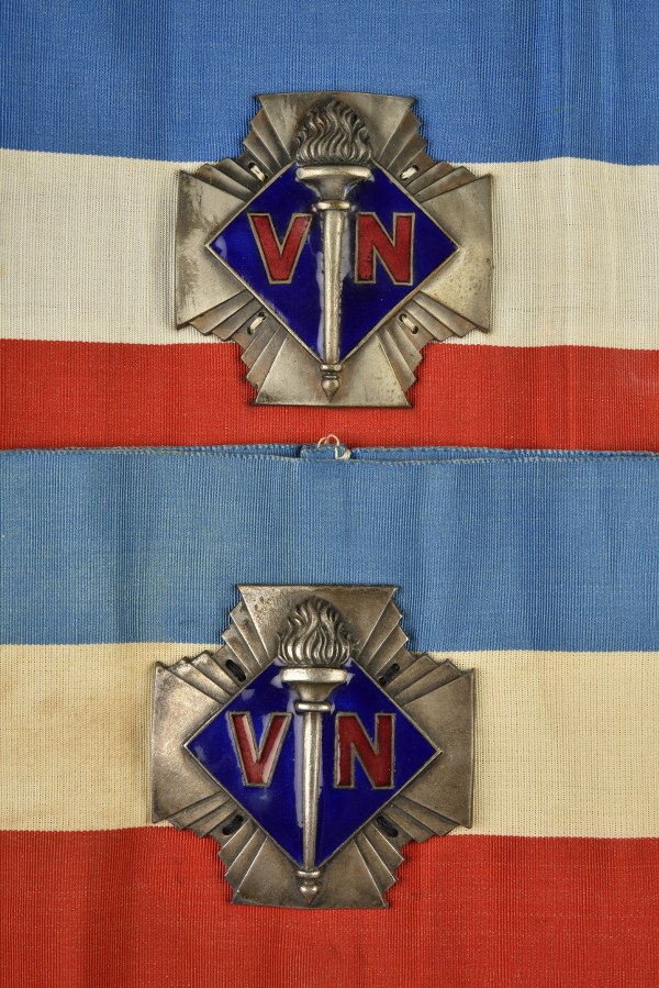 Ensemble comprenant un brassard en tissu tricolore sur lequel se trouve cousu l'insigne en métal émaillé des Volontaires Nationaux . Brassard se fermant à l'aide de 3 petites pressions. Un second brassard en tissu tricolore sur lequel se trouve cousu l'insigne en métal émaillé des Volontaires Nationaux. Brassard se fermant à l'aide d'une boucle à deux ardillons. On y joint une gourmette en métal , sur la face avant se trouve l'insigne des Volontaires Nationaux et sur la face arrière les chiffres : 5159. II+