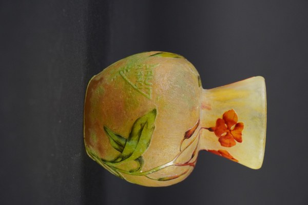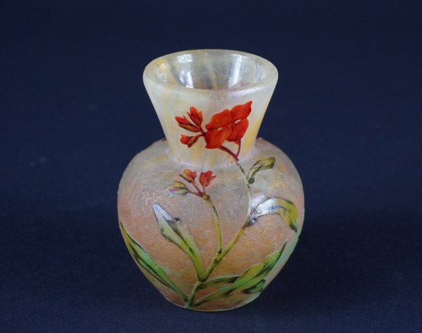 DAUM Nancy. Petit vase pansu à col pincé et évasé, dégagé à l'acide, émaillé de délicates petites fleurs de giroflées sur un fond granité jaune nuancé. Signature DAUM Nancy à l'écusson. Époque 1900. Parfait état. Hauteur : 8,2 cm. Panse : 6,5 cm. Diamètre au col : 4,5 cm et à la base 3,7 cm.