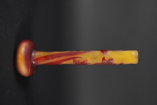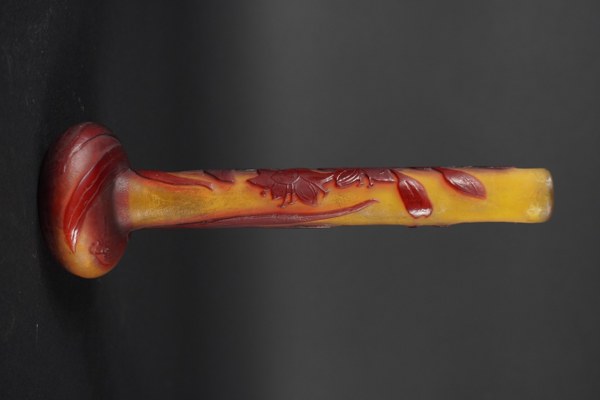 Emile GALLE (1846-1904). Vase soliflore à long col et base aplatie en verre multicouches à décor floral rouge dégagé à l'acide sur fond orange. Signé dans le décor. Vers 1900. Hauteur : 21 cm. Diamètre : 7 cm.