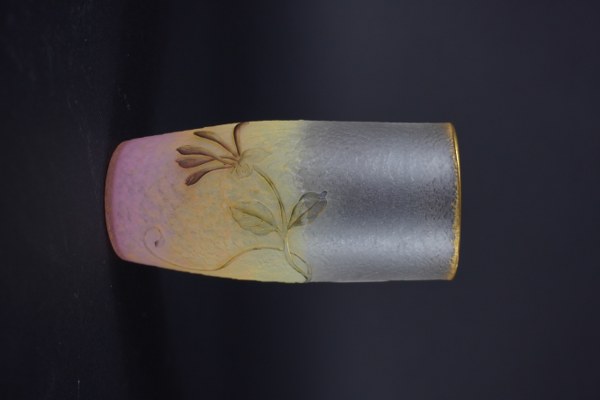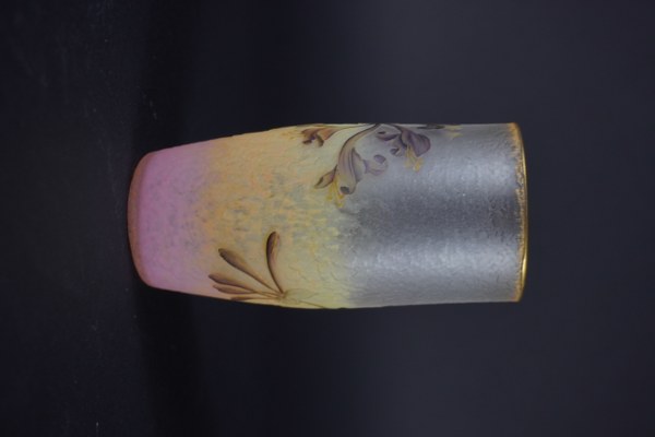 DAUM Nancy. Vase gobelet en verre multicouche dégagé à l'acide décoré de fleurs rehaussées d'or, sur fond givré rose dégradé jaune et blanc. Porte la double signature Daum Nancy avec croix de Lorraine à l'or ainsi que Clain et Perrier st Germain Paris à la pointe. Vers 1900. Hauteur : 12,5 cm. Diamètre : 6 cm.