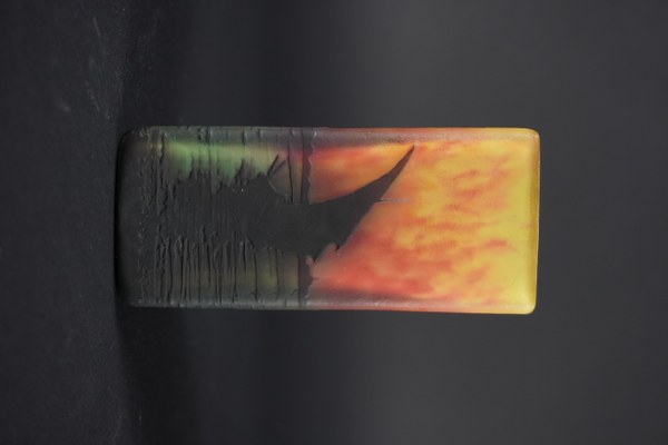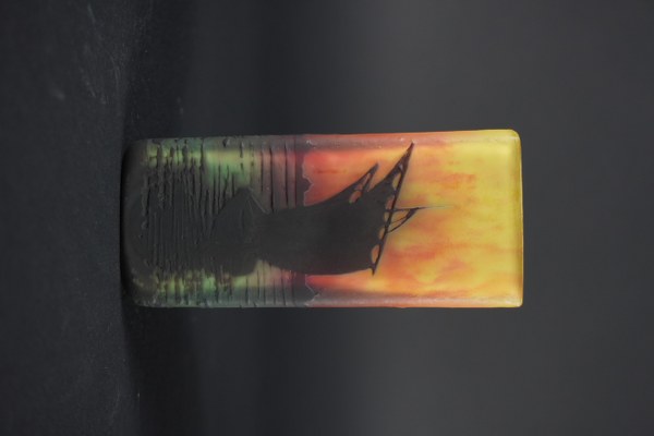 DAUM Nancy. Vase de forme quadrangulaire à bords arrondis, en verre multicouche dégagé à l'acide de décor de paysage maritime et bateaux. Signature DAUM Nancy et croix de Lorraine incisée sous la base. Vers 1900. Hauteur : 12 cm. Longueur : 5,5 cm.