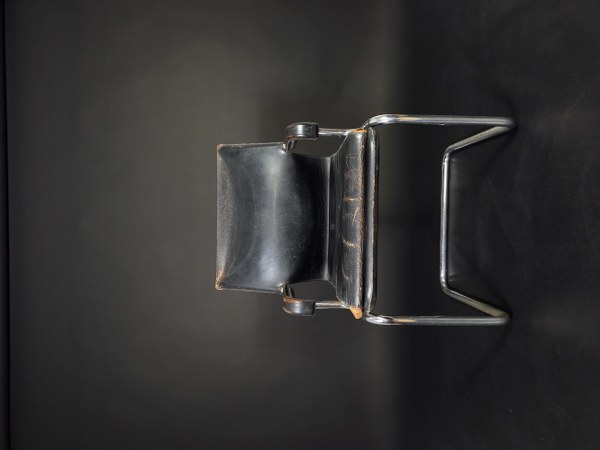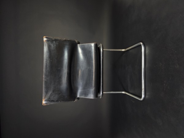 Paolo DEGANELLO (né en 1940) & Gilberto CORRETTI (1941-2023) & Marcatre éditeur. Fauteuil modèle "uno" à structure tubulaire en métal chromé, assise et accoudoir en cuir piqué. Vers 1970. 87 x 57 x 50 cm. Oxydation, cuir usagé et décousu.
