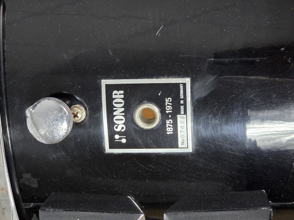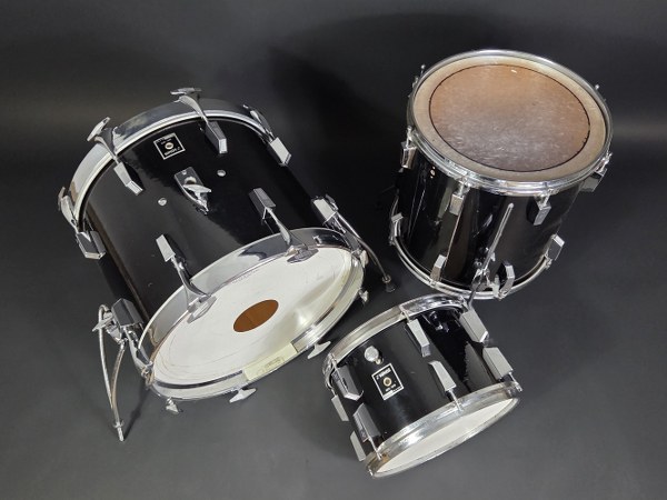 SONOR. Batterie « série anniversaire 1875-1975 » modèle phonie (xk 984). Trois fûts aux dimensions suivantes : 12 x 8, 14 x 14, 18 x 14 pouces. Le rhodoïd, de couleur high gloss black, est d'origine. A noter, la Fixation (holder) du tom sur la grosse caisse est manquante. Quelques traces d'usage.