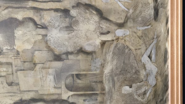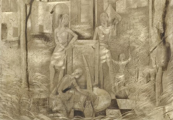 Attribué à Pierre Adrien EKMAN (1904-1993). Paysage onirique. Technique mixte, triptyque. Vers 1940. Dimensions totales : 87 x 201 cm.