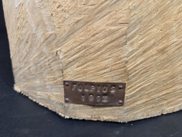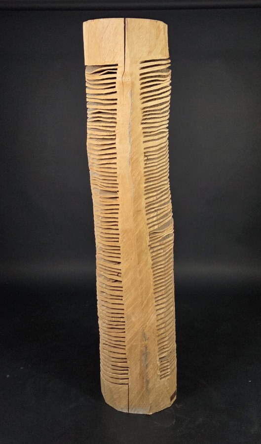 Mireille FULPIUS (né en 1951). Sculpture. Colonne à ailettes travaillée à la tronçonneuse. Signée et datée 1997 sur une plaque en métal. 147 x 30 cm.