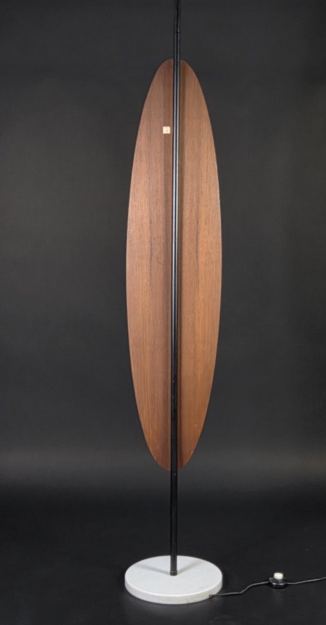 Gioffredo REGGIANI (né en 1929) & Reggiani éditeur. Lampadaire surf. Support en teck, trois diffuseurs en opaline, montant en métal laqué noir et piétement circulaire en marbre. Vers 1960. Hauteur : 182 cm. Diamètre : 30 cm.