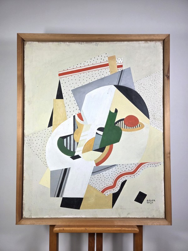Béla KADAR (1857-1956). Nature morte abstraite. Huile sur toile, signée en bas à droite. 92 x 73 cm. Porte une étiquette de transport pour l'exposition « L'avant garde Hongroise » ainsi que le nom du prêteur.
