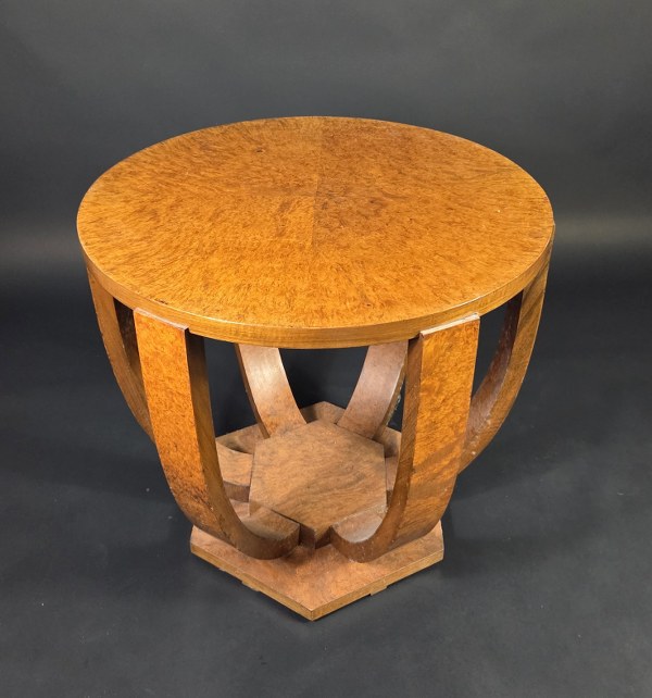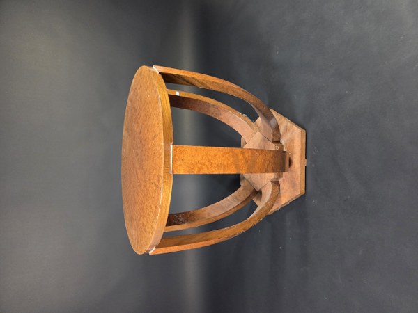 Dans le goût de Jules LELEU. Guéridon circulaire en bois de placage à six montants courbés. Vers 1925. Hauteur : 65 cm. Diamètre : 70 cm. Légères traces d'usage.