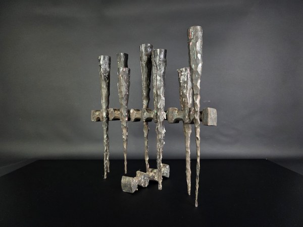 David PALOMBO (1920-1966). Sculpture de candélabre Menorah en fer forgé. Vers 1960. Hauteur : 42 cm. Longueur : 43 cm. Largeur : 17 cm. Dans son jus, traces d'usage, coulures de cire.