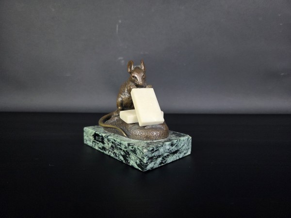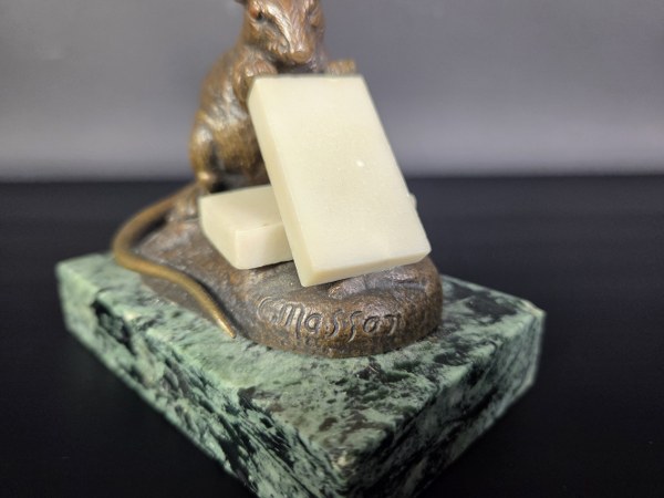 Clovis Edmond MASSON (1838 -1913). La souris grignotant. Epreuve en bronze à patine brune et morceaux de sucre en albâtre, signée en creux sur le côté. Hauteur : 10 cm. Longueur : 11 cm. Largeur : 6,5 cm.