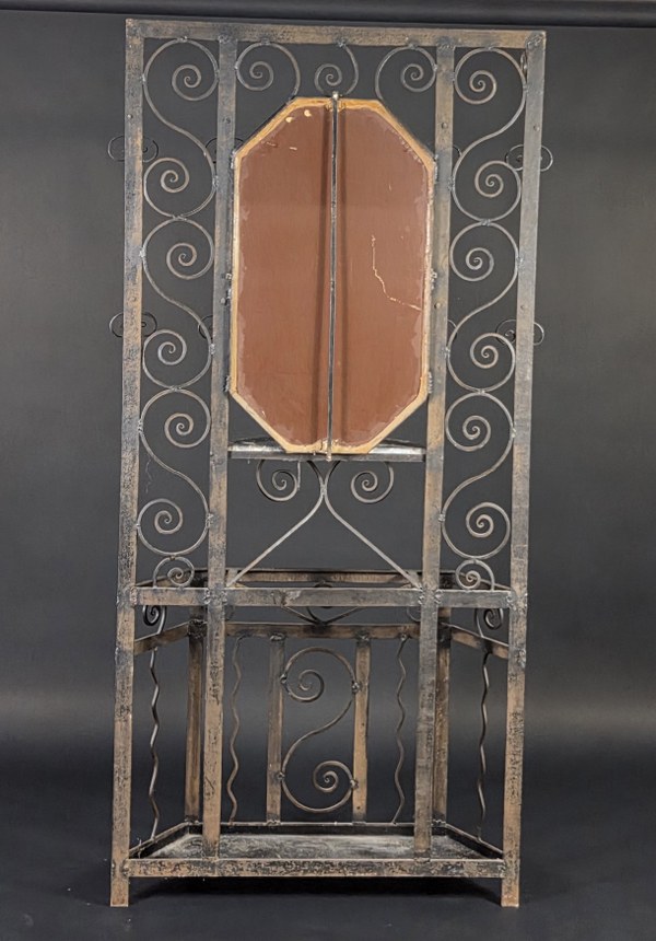 Vestiaire d'applique en fer forgé, enchâssant un miroir à vue octogonale en partie centrale et console à plateau en marbre, patères et porte-parapluies à décor ajouré de volutes. Travail 1930. 183 x 85 x 20 cm.