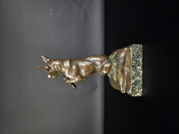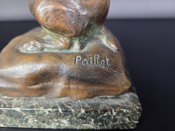 Charles PAILLET (1871-1937). Chien au morceau de sucre. Bronze à patine brun clair, marbre blanc, signé en creux sur le coussin. Vers 1920. Hauteur : 23 cm. Longueur : 11 cm. Largeur : 11,5 cm.