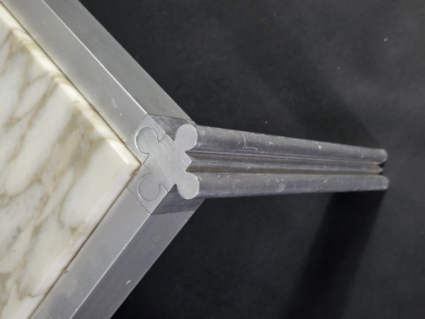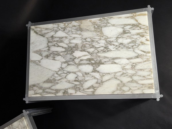 George CIANCIMINO (né en 1928) & MOBILIER INTERNATIONAL Éditeur. Paire de tables basses rectangulaires, à piétement en aluminium à section tubulaire trèfle, plateau en marbre. Vers 1970. 40 x 88 x 59 cm. Traces d'usage, un marbre cassé.