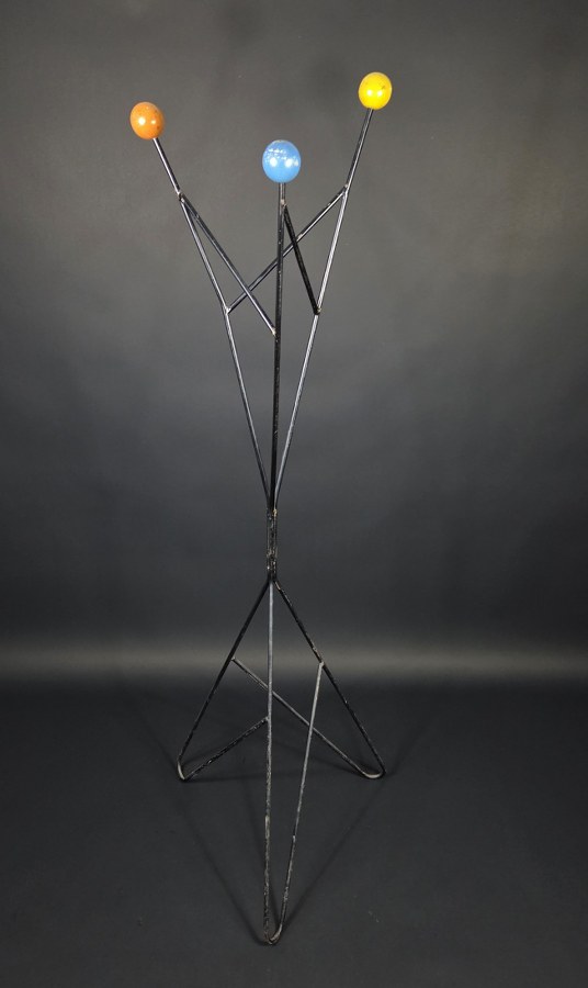 Porte-manteau à structure en métal de section ronde laqué noir terminée par des boules en bois laqué de différentes couleurs. Travail 1950. 167 x 57 x 55 cm.