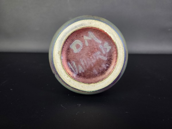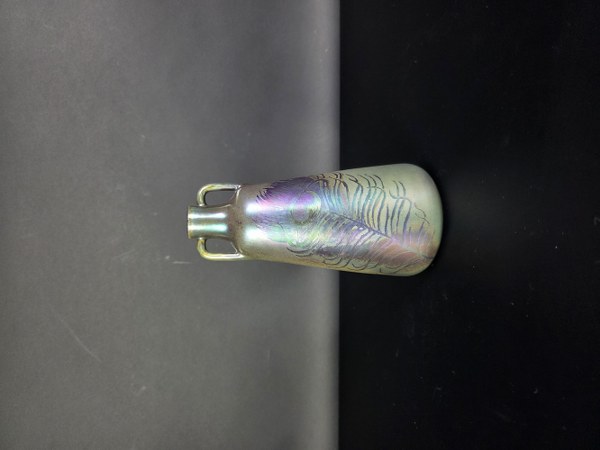 Delphin MASSIER (1836-1907). Vase de forme conique en céramique irisée à deux anses appliquées en partie haute à décor de plumes de paon. Signé. Hauteur : 17,5 cm. Diamètre : 9 cm.
