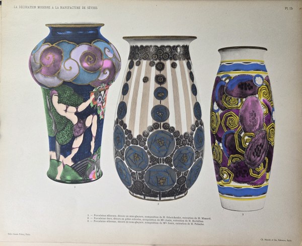 Céramique : LECHEVALLIER CHEVIGNARD. La Décoration moderne à la Manufacture nationale de Sèvres. Paris, Massin, Album in-folio de 24 très belles planches de céramique Art déco dont 12 en couleurs. Vers 1925. 42 x 33 cm