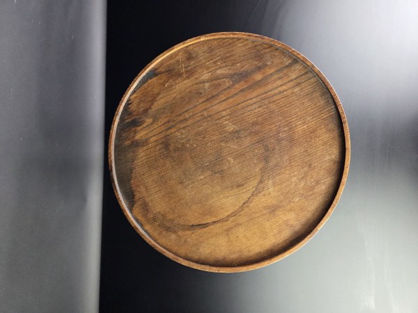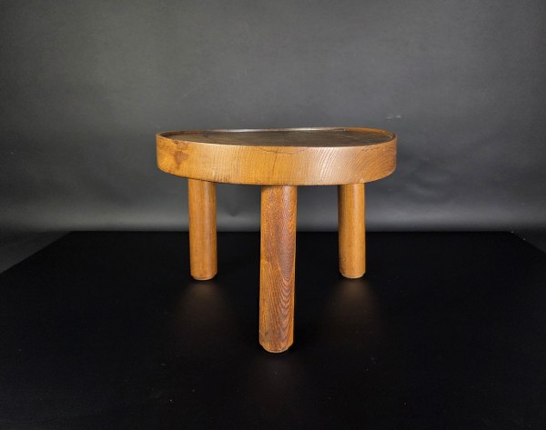 Mado JOLAIN (née en 1921) et René LEGRAND (1923-1996) & I/d éditeur. Table d'appoint en frêne à plateau circulaire et piétements tubulaires rondin. Estampillée sous la base. Vers 1955. Hauteur : 25 cm. Diamètre : 35 cm. Traces d'usage et d'usure.