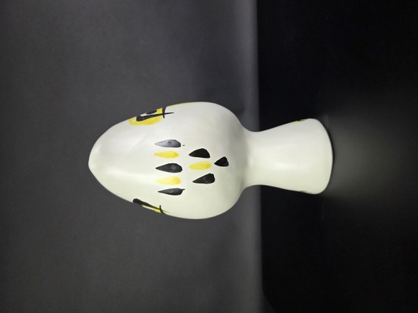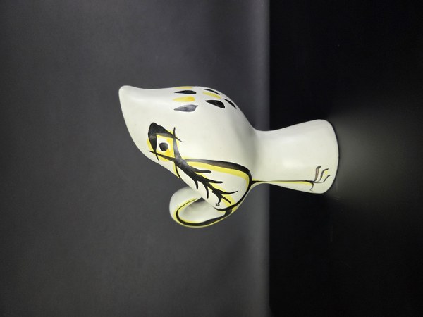 Roger CAPRON (1922-2006). Pichet zoomorphe en céramique émaillée à décor polychrome noir et jaune sur fond blanc d'un oiseau stylisé. Signé « Capron Vallauris ». Hauteur : 23 cm. Longueur : 21 cm. Largeur : 12 cm.