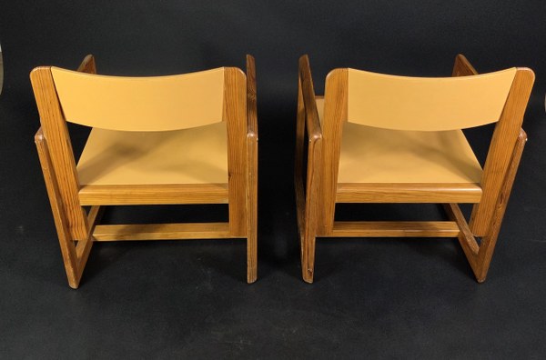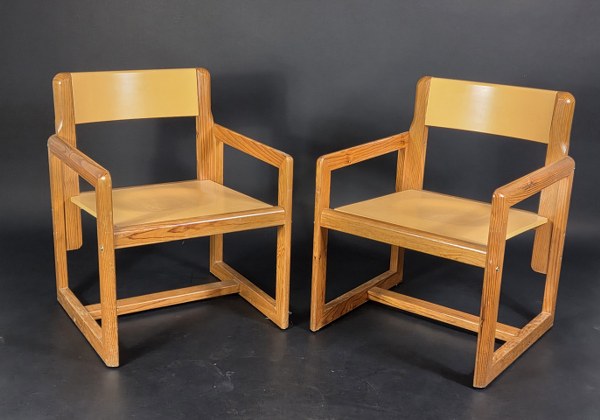 André SORNAY (1902-2000) & Les Établissements Sornay éditeur. Paire de fauteuils en pin, assise et dossier laqués jaune. Mobilier à tigettes. Vers 1970. 71 x 56 x 55 cm. Légères traces d'usage.