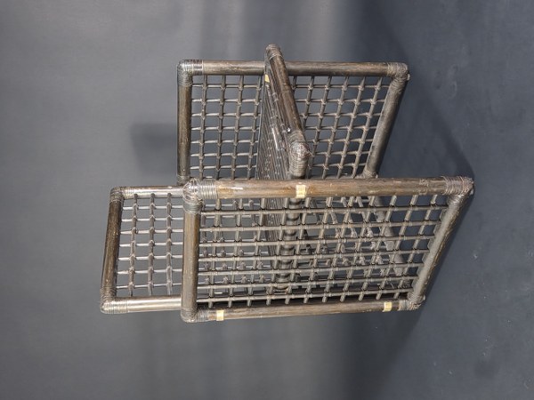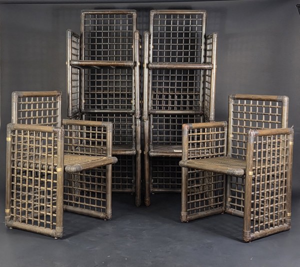 Afra SCARPA (1937-2011) et Tobia SCARPA (1935) et Production Company of the Philippines. Suite de six fauteuils de la série Basilian en bambou, rotin et cuir. Vers 1975. 85 x 54 x 54 cm. Traces d'usage et d'usure.