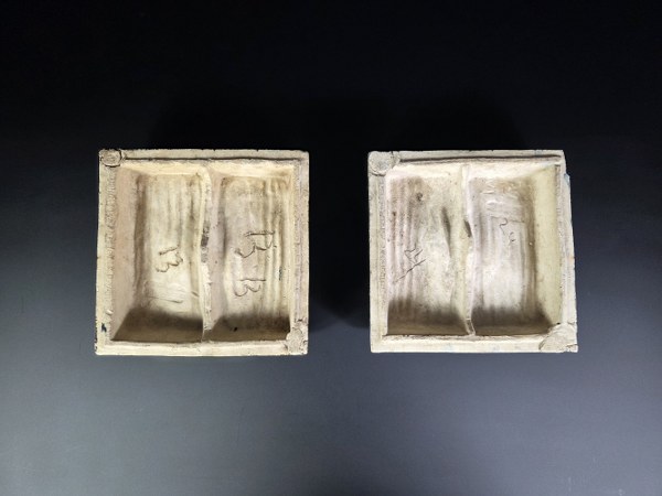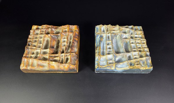 Roger GUERIN (1896-1954). Ensemble de deux pavés muraux en céramique émaillée. Signé d'un cachet en creux. Hauteur : 6 cm. Longueur : 20 cm. Largeur : 19,5 cm. Quelques légers choc.