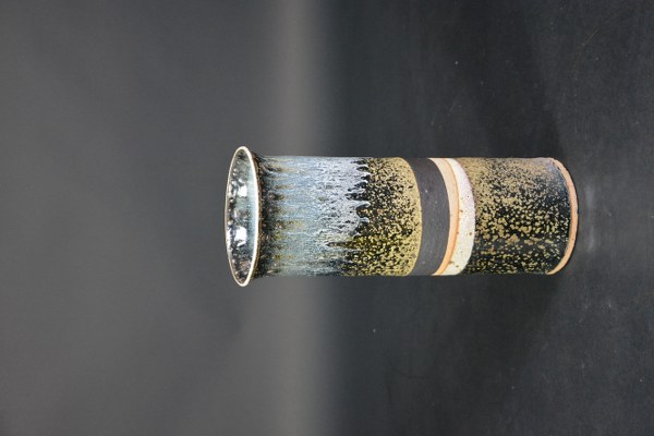 Grand vase rouleau en grès émaillé à décor de bandes noires, grises et terre sur fond noir moucheté brun. Hauteur : 47 cm. Diamètre : 19 cm. Crack de cuisson sous la base.