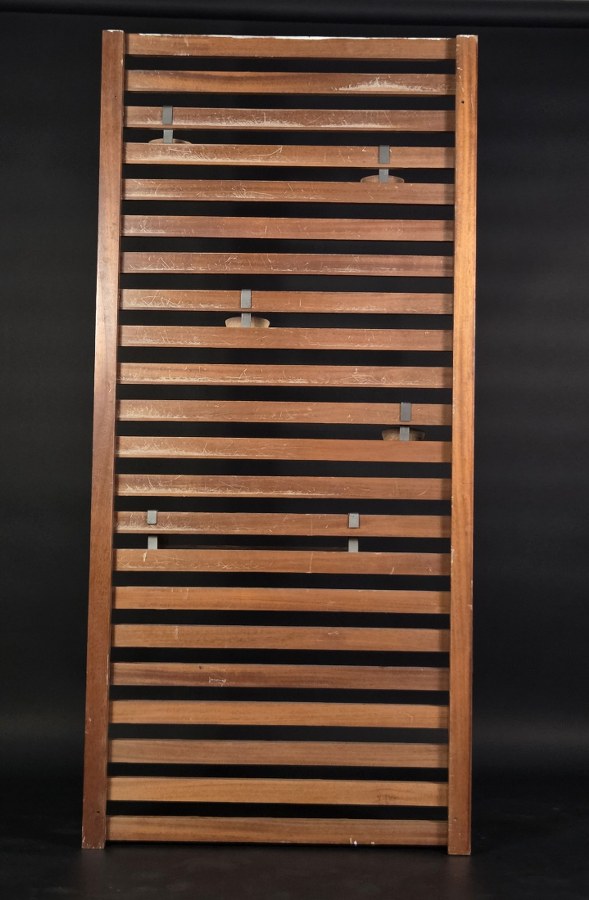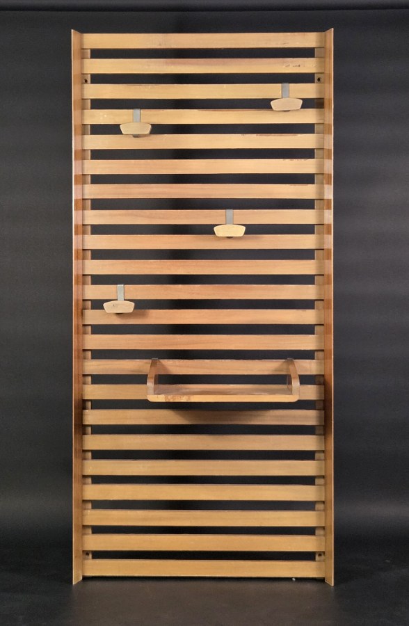 Georges FRYDMAN (né en 1924) & EFA éditeur. Porte-manteau mural à lattes en bois exotique présentant quatre patères et une tablette amovibles en bois et lame d'acier. Vers 1955 168 x 78 cm. Traces d'usage et d'usure.