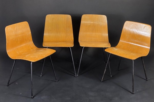 Pierre GUARICHE (1926-1995) & Steiner éditeur. Suite de quatre chaises "Papyrus", à piétement tubulaire en métal laqué noir, assise en bois thermoformé découpé. Vers 1950. 75 x 43 x 45 cm. Placage abîmé, très légères traces d'usage.