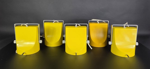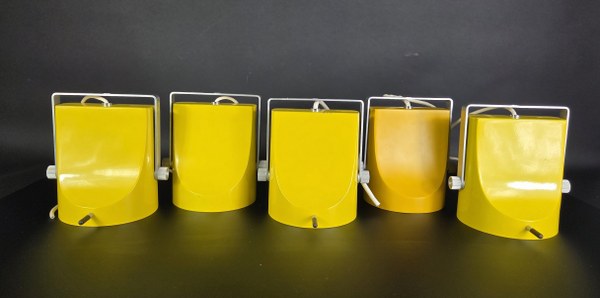 Étienne FERMIGIER (1932-1973) & Disderot éditeur. Suite de cinq appliques modèle "F - 39". Lampes spot orientables laquées jaune. Vers 1970. Hauteur : 18 cm. Diamètre : 14 cm.